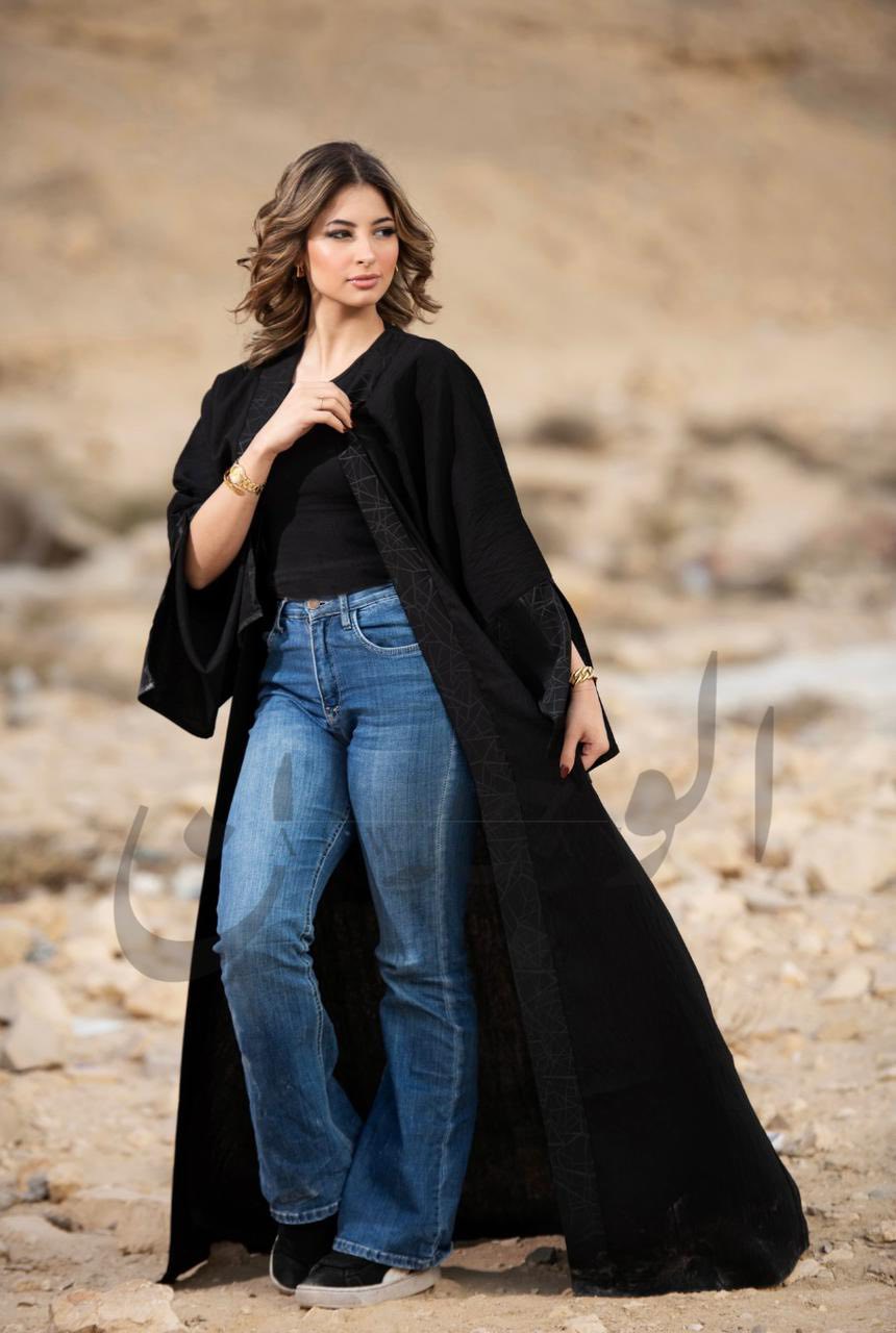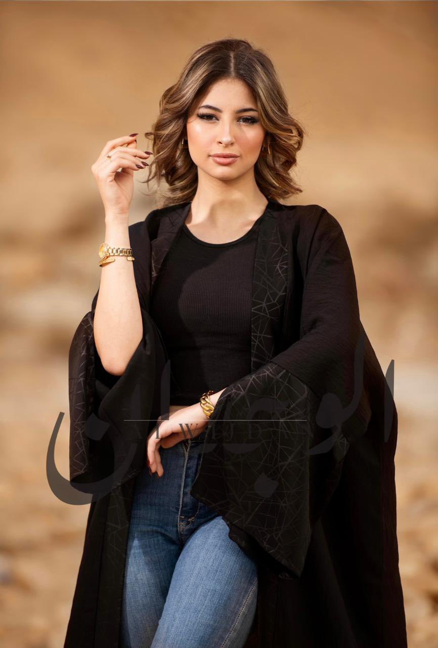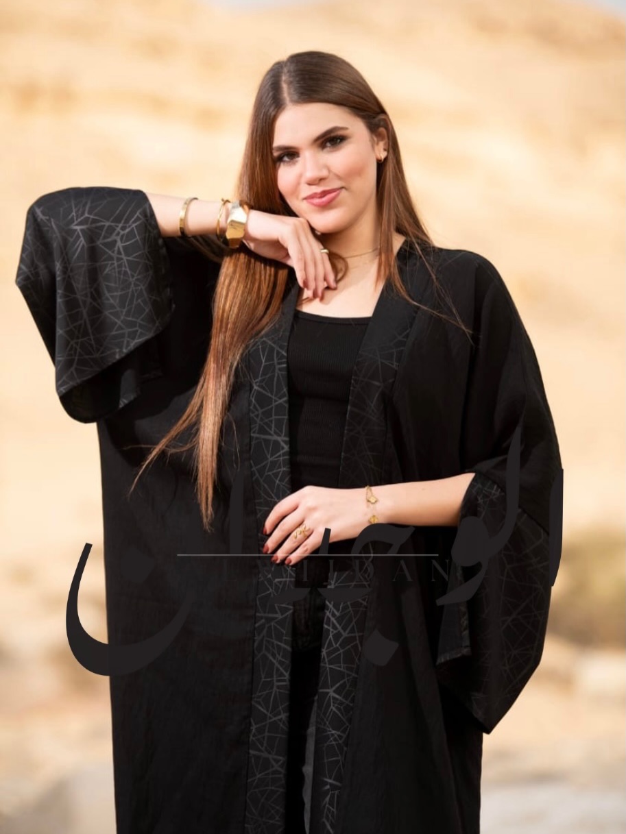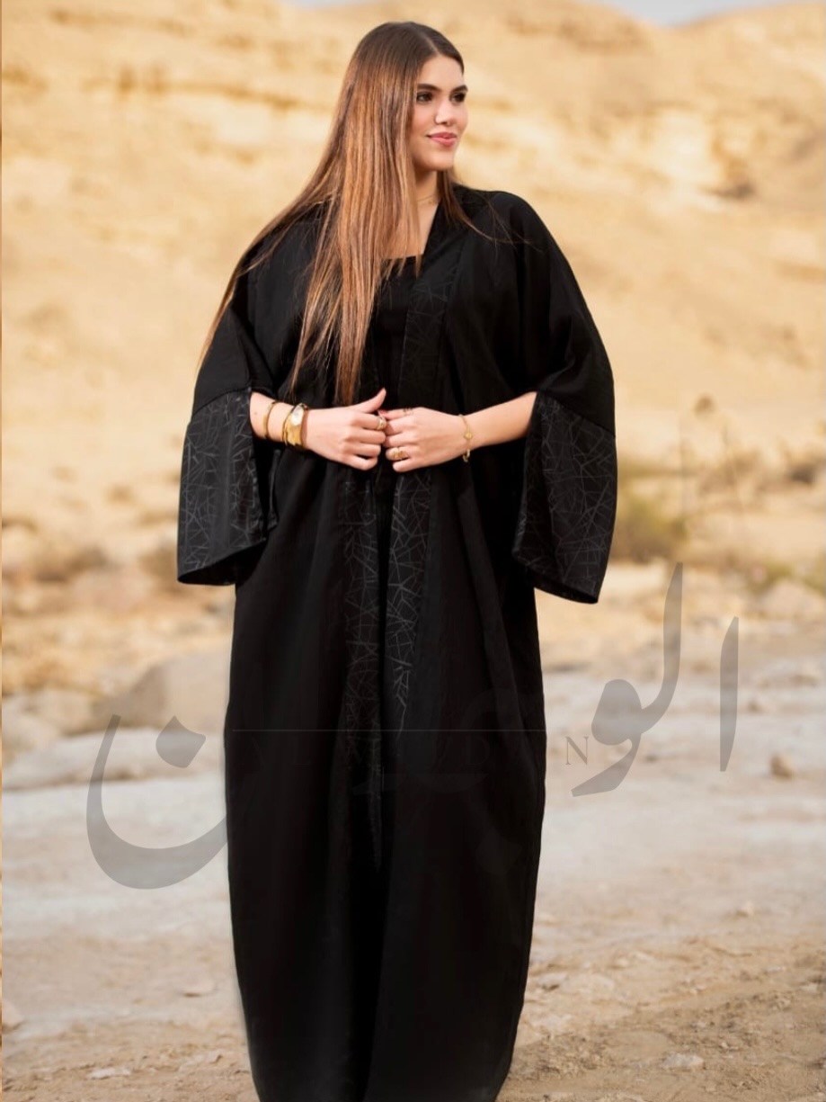 قفطان باللون الأسود الخالص مع مودیل ممیّز في الأكمام ونقشات سوداء ناعمة، أناقة ھادئة تعبّر عن فخامة خالدة